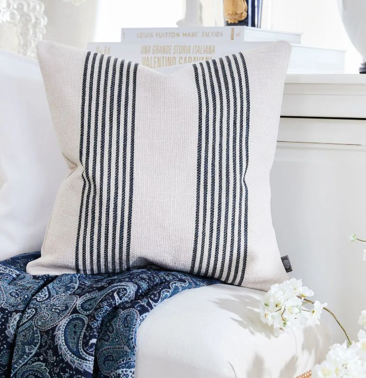 The Waldron Stripe from Artwood is an elegant cushion cover in off-white with black stripes.